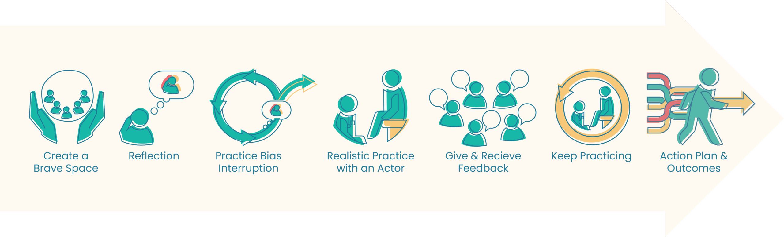 Our approach leverages realistic practice rooted in creating brave spaces with psychological safety.